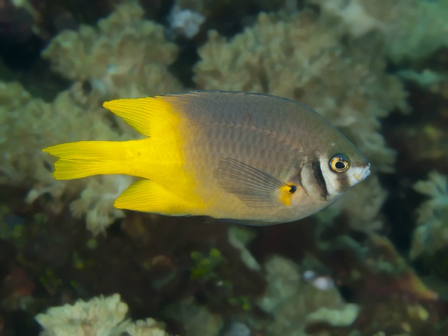 Behn's damsel, Behn's damselfish, Black and yellow damsel, Scarface damsel, Scar-face damsel-fish, Scarface damsel, Yellow honey chromis, Yellowfin damsel.