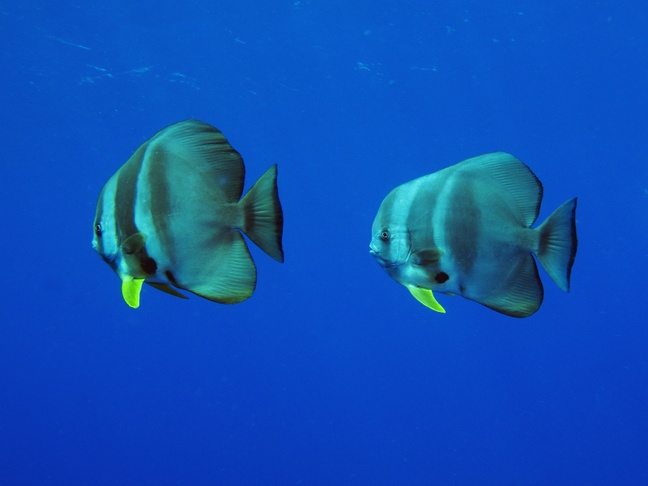 The adult Longfin batfish is commonly confused with the Orbicular batfish. It can easily be distinguished though by the dark blotch below the pectoral fin. It can reach up to 65 cm in length. These fish occur inshore and near seaward reefs up to a depth of 70 meters. They are frequently found in and around shipwrecks. Usually they are swimming in small groups and sometimes form large schools. Like most batfishes, this species is unafraid of divers. The Longfin batfish feeds on algae, zooplankton and small invertebrates.