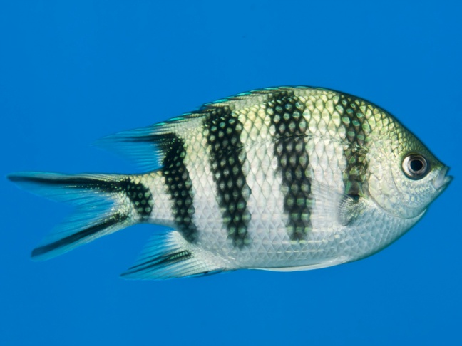 Scissor-tail sergeant, Six-banded sergeant-major, Six-barred sergeant-major, Stripe-tailed damsel-fish, Stripetail damsel, Stripetailed damselfish.