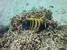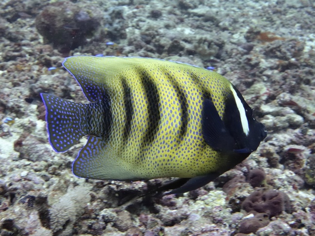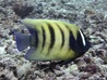 The adult Sixbar angelfish has a yellowish body with five vertical black bars on the side and one white bar behind each eye. It can reach up to 46 cm in length. In the juvenile phase it has a black body with vertical white bars. Male and female are indistinguishable in color from each other. They occur singly or in pairs and can usually be found in lagoons with rich coral growth, on reef faces and on reef slopes. These fish are often hanging out near cleaning stations of Bluestreak cleaner wrasses (Labroides dimidiatus). They are found at depths from 3 to 50 meters. When approached the Sixbar angelfish are known to grunt in warning. The main food contains fish eggs, sponges, worms and mollusks.