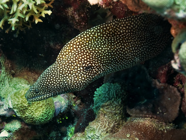 Guinea moray eel, Guineafowl moray, Guinefowl moray, Painted moray, Puhi'onio, Spotted eel, Spotted moray, White-mouth moray, White-spotted moray, Whitemouth moray.